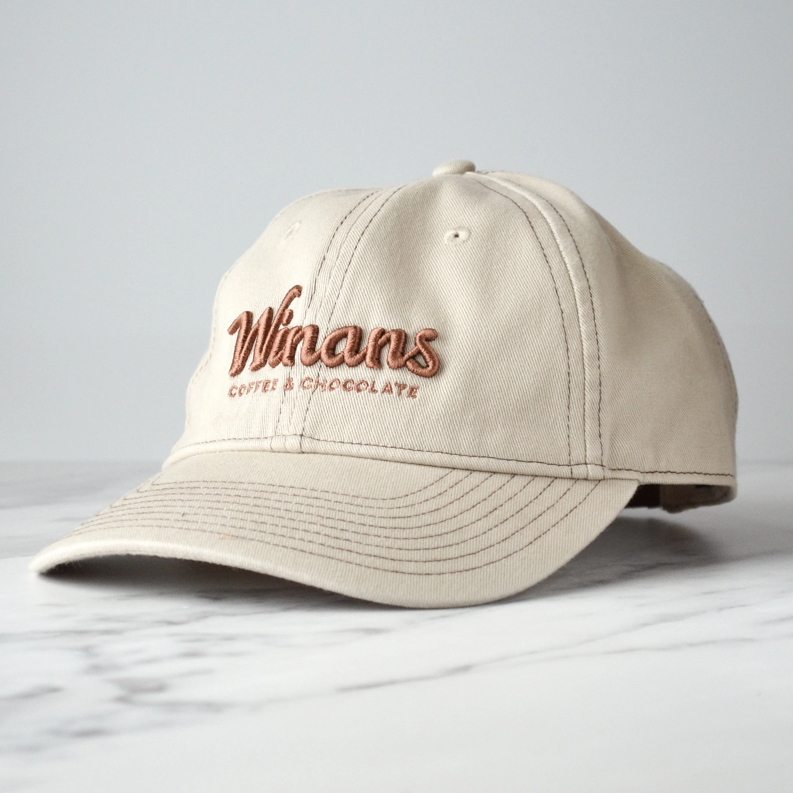 Cover your head with a Winans baseball cap! This hat is constructed with soft, cream canvas with a broken-in feel, brown contrasting stitching, an embroidered Winans logo, and an adjustable leather back strap. It pairs great with your comfiest clothes and your favorite cup of Winans coffee.