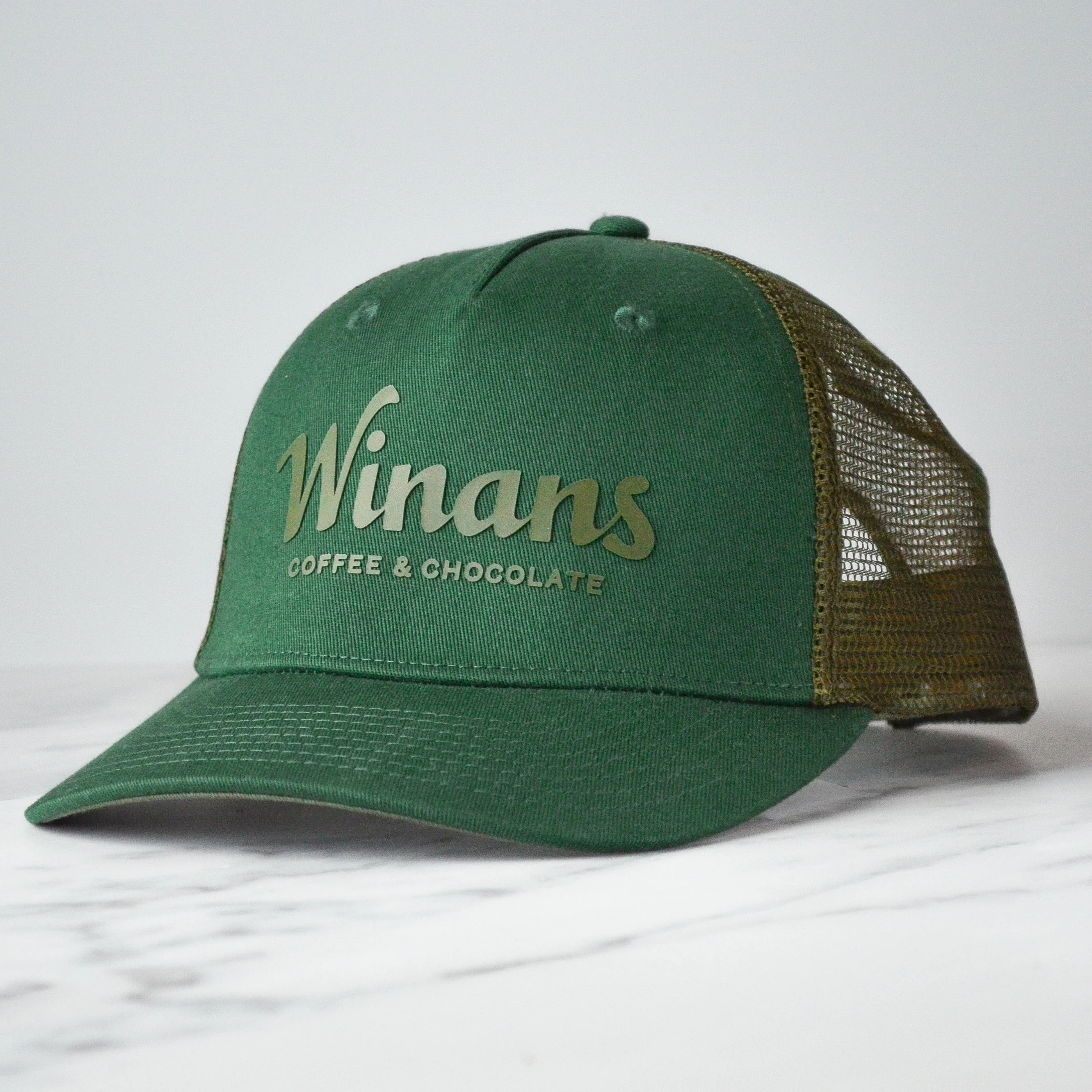 A Winans Trucker Hat makes a great gift for the coffee and chocolate lover in your life. This hunter-green snap-back hat features an olive mesh back and a 3D PVC rubber Winans logo. This is the one you throw on every single morning when you pick up your favorite Winans coffee drink.